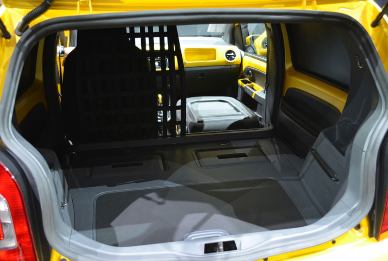 Грузовой отсек Volkswagen e-load up! 2015 имеет ровный пол. Внутри — четыре кольца для фиксации груза. Примечательная особенность: доступ к нему возможен как через заднюю, так и через боковые сдвижные двери. Чтобы груз не сдвигался, в конструкции багажника используется сетчатая решетка, износостойкая внутренняя обивка бортов, со своей стороны, позволит избежать повреждения отсека при перевозке различных типов грузов.