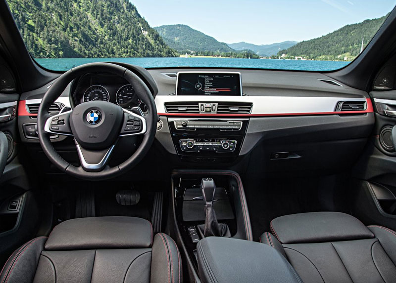 Салон БМВ Х1 2016 отделан тканью с темными матовыми декоративными планками. В оснащении автомобиля есть автоматический двухзонный климат-контроль, подогрев передних сидений, спортивный кожаный руль, спинка заднего сиденья, складывающаяся в соотношении 40:20:40, функция автоматического открывания крышки багажника. А еще — аудиосистема с 6 динамиками, бортовой компьютер, мультимедийная система iDrive с дисплеем диагональю 6,5 дюйма на передней панели и системой громкой связи Hands-free Bluetooth, пакет услуг BMW Teleservices.