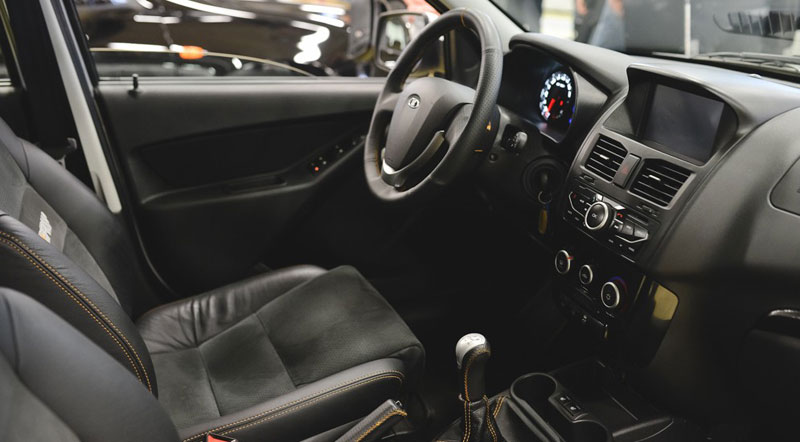 В список оборудования Lada Kalina NFR входят: фронтальные подушки безопасности, антиблокировочная система тормозов (ABS) с усилителем экстренного торможения (BAS), электронная система распределения тормозных усилий (EBD), кожаная обивка сидений и такая же оплетка рулевого колеса, рукоятки КПП и рукоятки ручного тормоза, зеркала с электроприводом и обогревом, обогрев лобового стекла, подогрев передних сидений, датчики дождя и света, парктроник, климат-контроль, мультимедийная система с сенсорным экраном. В общем, ничего так…