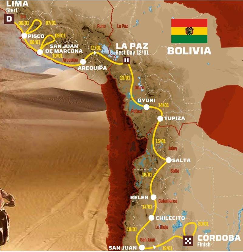 Чем интересен нынешний ралли-марафон «Дакар»? Прежде всего, изменением маршрута. В этом году организаторы решили отказаться от последних этапов в Аргентине и финиша гонки в Буэнос-Айресе. Гонка начинается 6 января в столице Перу Лиме. Всего предусмотрено 14 этапов с финишем в аргентинской Кордобе. Общая протяженность маршрута составит около девяти тысяч километров; самый длинный спецучасток — 498 км.