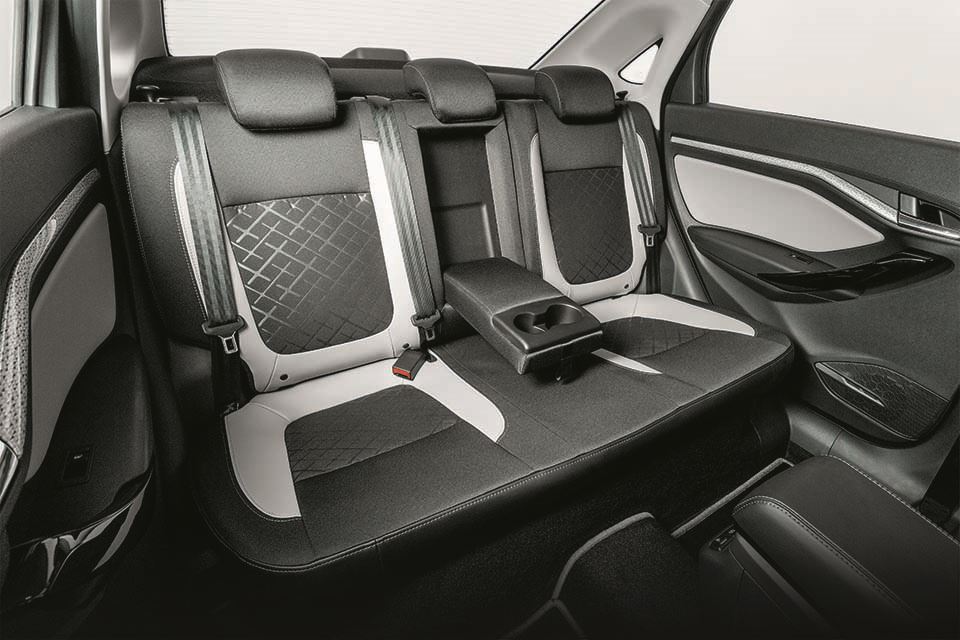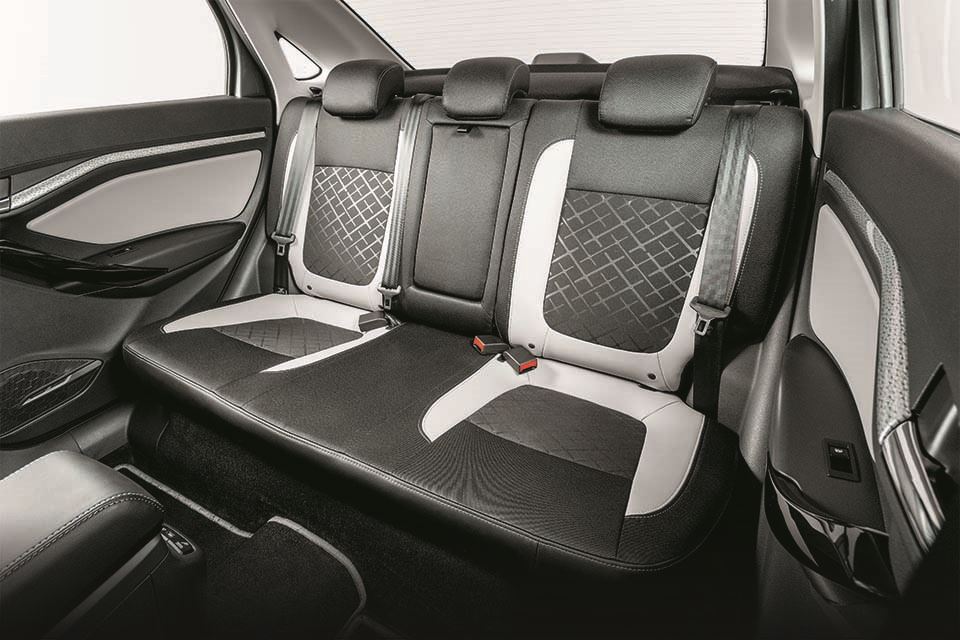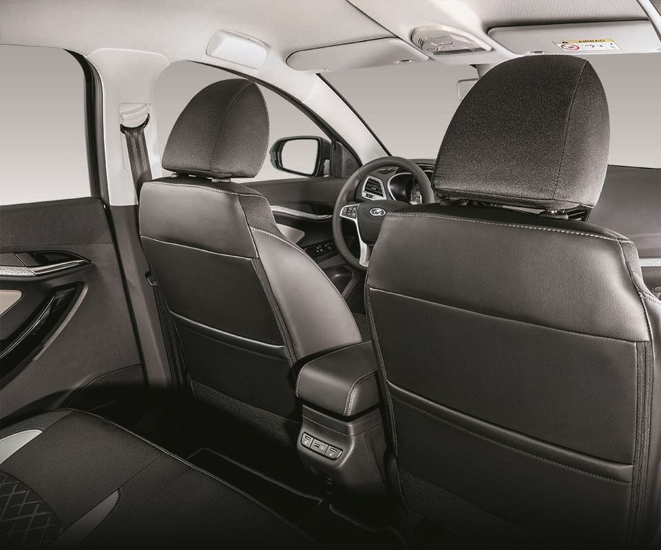 Материалы отделки у седана Lada Vesta Cross 2019 совпадают с теми, что были использованы в составе универсала Vesta SW Cross. К ним следует отнести экокожу, оранжевые или серые элементы, сочетающиеся со вставками на панелях дверей и приборной панели. Между передними сиденьями нашел себе место бокс с подлокотником — удобно и практично. Доработанная приборная панель использует уникальный цветовой код и особую подсветку, которая используется только в моделях, принадлежащих серии Cross.