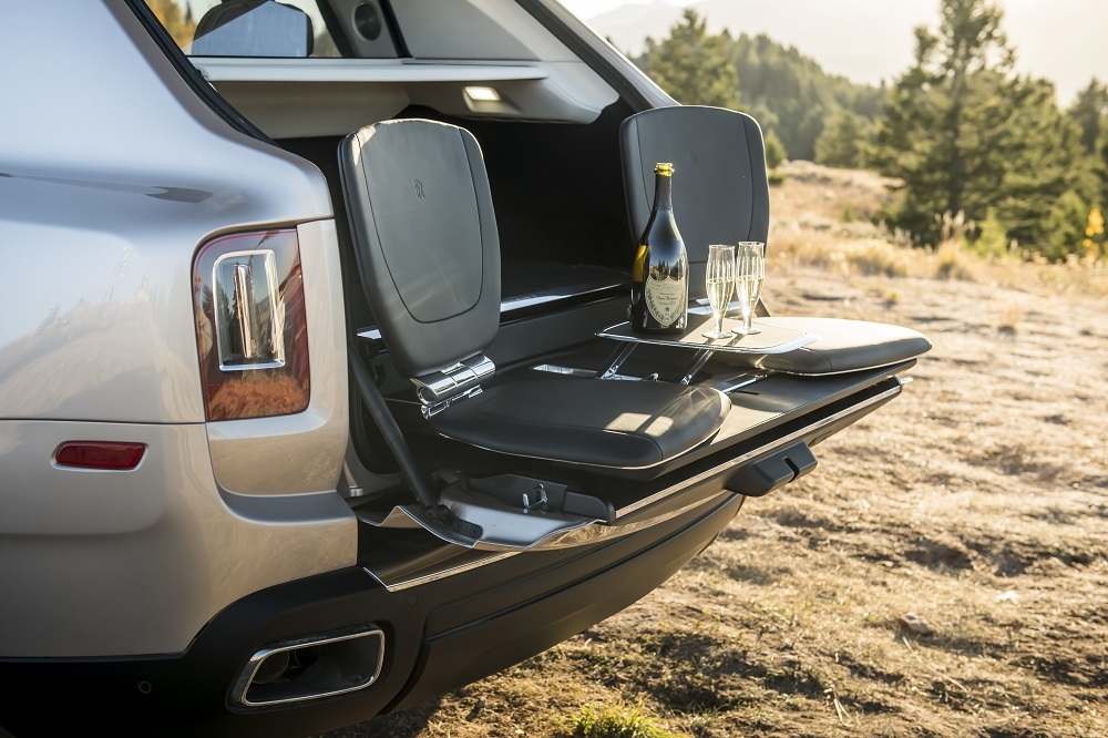 Rolls-Royce Cullinan имеет ряд уникальных опций, обеспечивающих этому автомобилю особенную индивидуальность. Самая необычная опция называется Viewing Suite. Под этим названием подразумеваются раскладные кресла и столик для коктейлей. Все это добро выдвигается из багажного отделения по нажатию кнопки. Зачем это? Чтобы водитель роскошного внедорожника мог поставить его задом к обрыву или берегу реки, выдвинуть коктейльный столик и, озирая красивые виды, медленно потягивать… тыквенный сок.