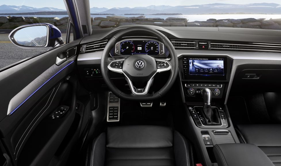 В салоне обновленного Volkswagen Passat 2020 следует обратить внимание на новое рулевое колесо, другую обивку из более качественных материалов. Аналоговые часы ушли в прошлое; вместо них красуется подсвечиваемый логотип Passat.