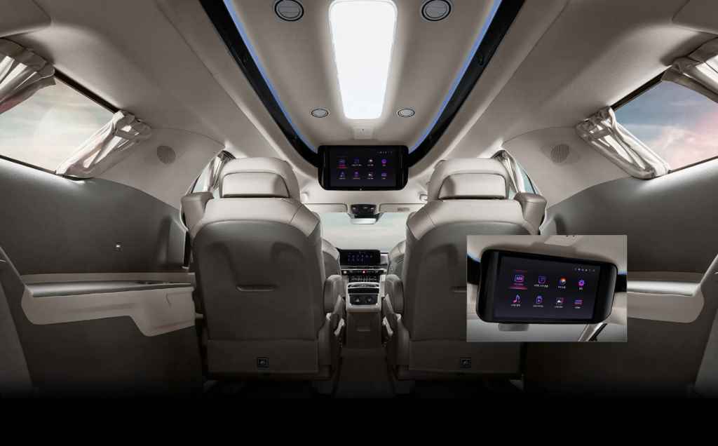 В списке доступных опций у Kia Carnival HiLimousine есть массажер для ног. Регулировать настройки положения сидений пассажиры могут с помощью 7-дюймового сенсорного дисплея. Он находится на консоли между ними. Другой вариант изменить положение спинки или подушки — загрузить специальное приложение на своем смартфоне.
