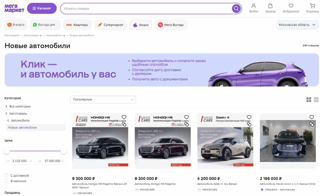 Мы уже немного знакомы с тем, как торгуют автомобилями на «Озоне». В случае с «Мегамаркетом» примерно то же самое. Пока воспользоваться услугами маркетплейса могут онлайн-покупатели из Москвы и Санкт-Петербурга.